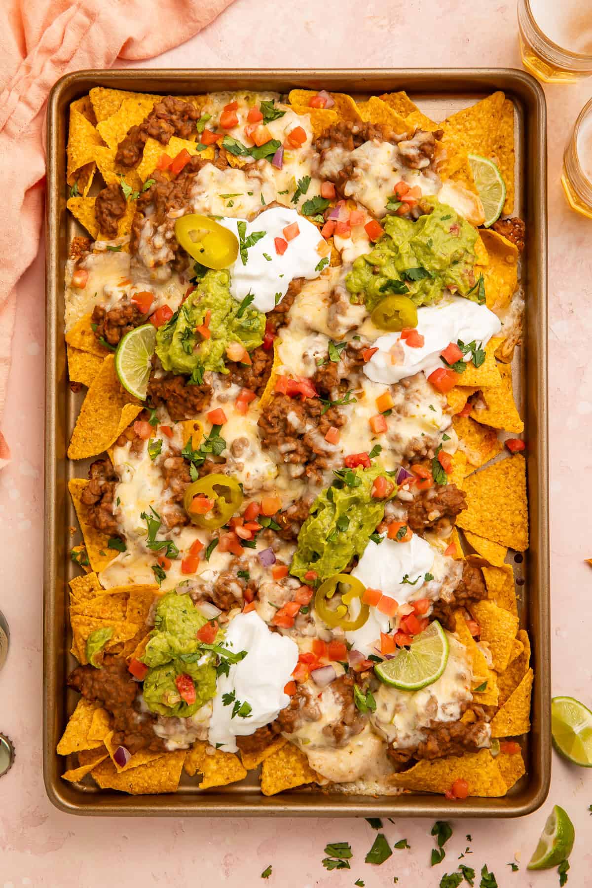 - To the parchment-lined baking tray, add half of the tortilla chips. Sprinkle the chips evenly with half of the ground beef mixture, half the queso, half the shredded cheese. Top with the remaining half of tortilla chips, ground beef mixture, remaining shredded cheese, and remaining queso.