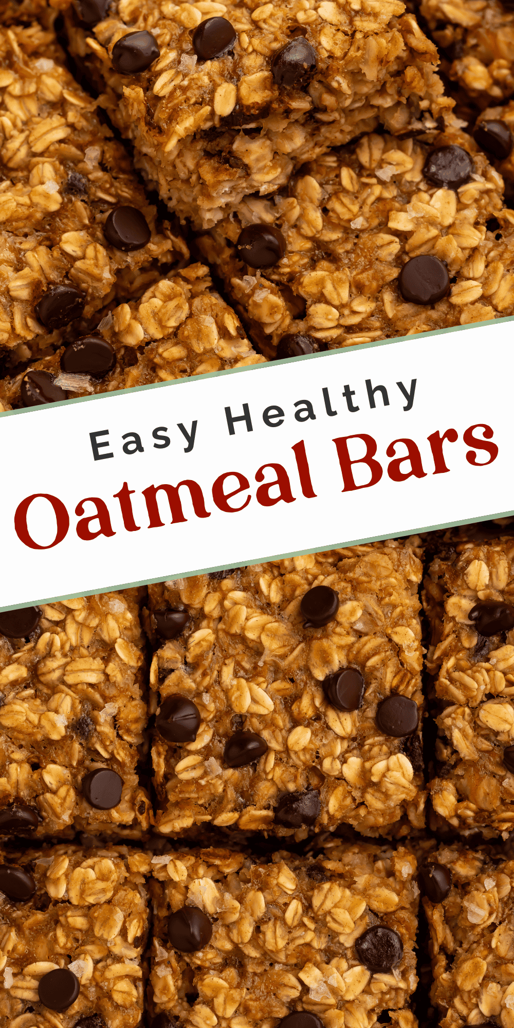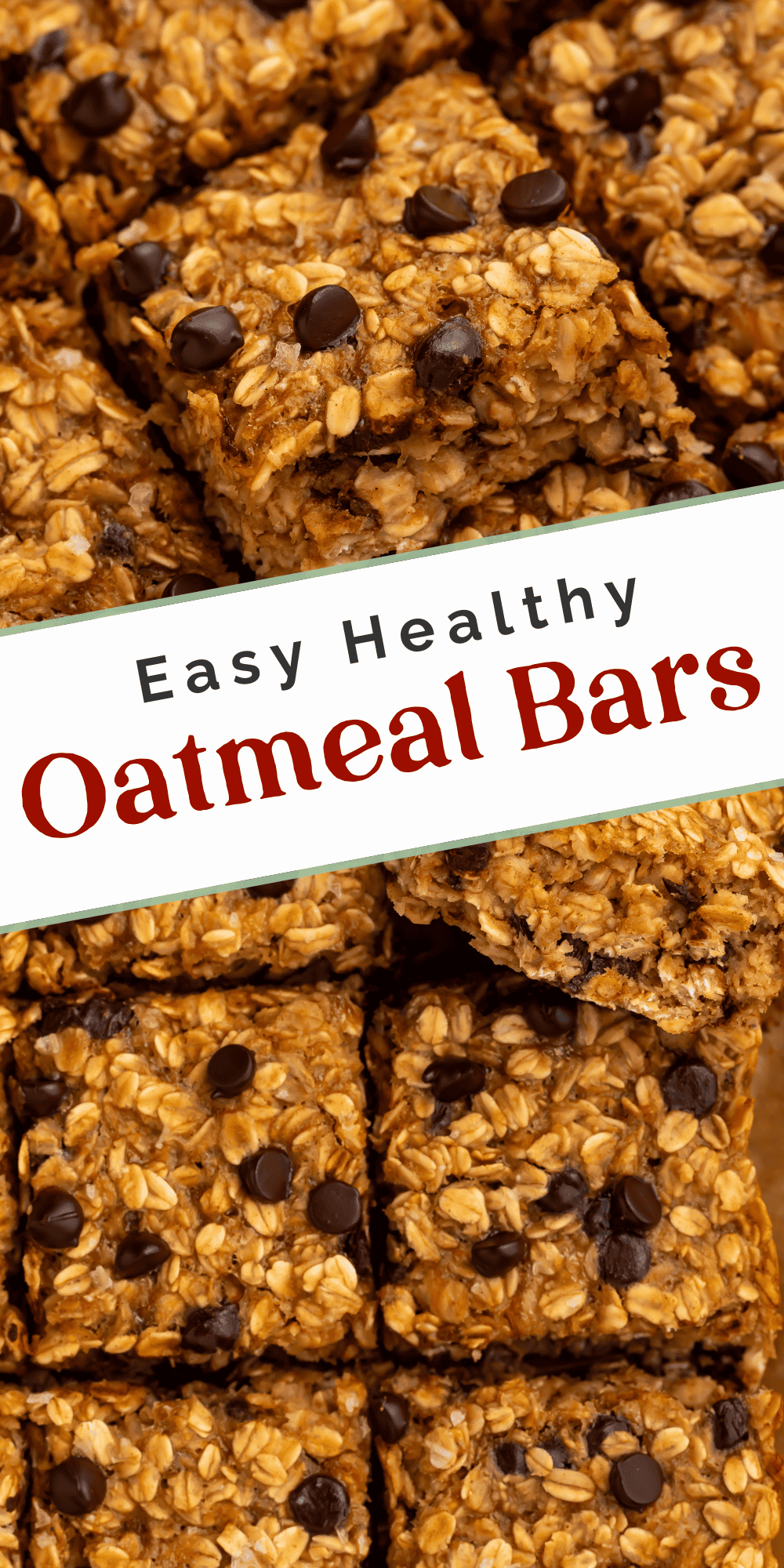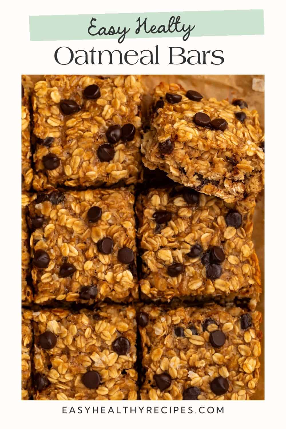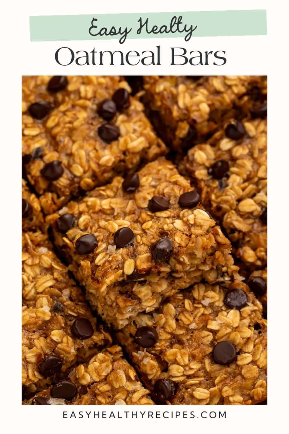 Close up of oatmeal bars with chocolate chips cut into squares. There is a Pinterest-optimized text overlay.