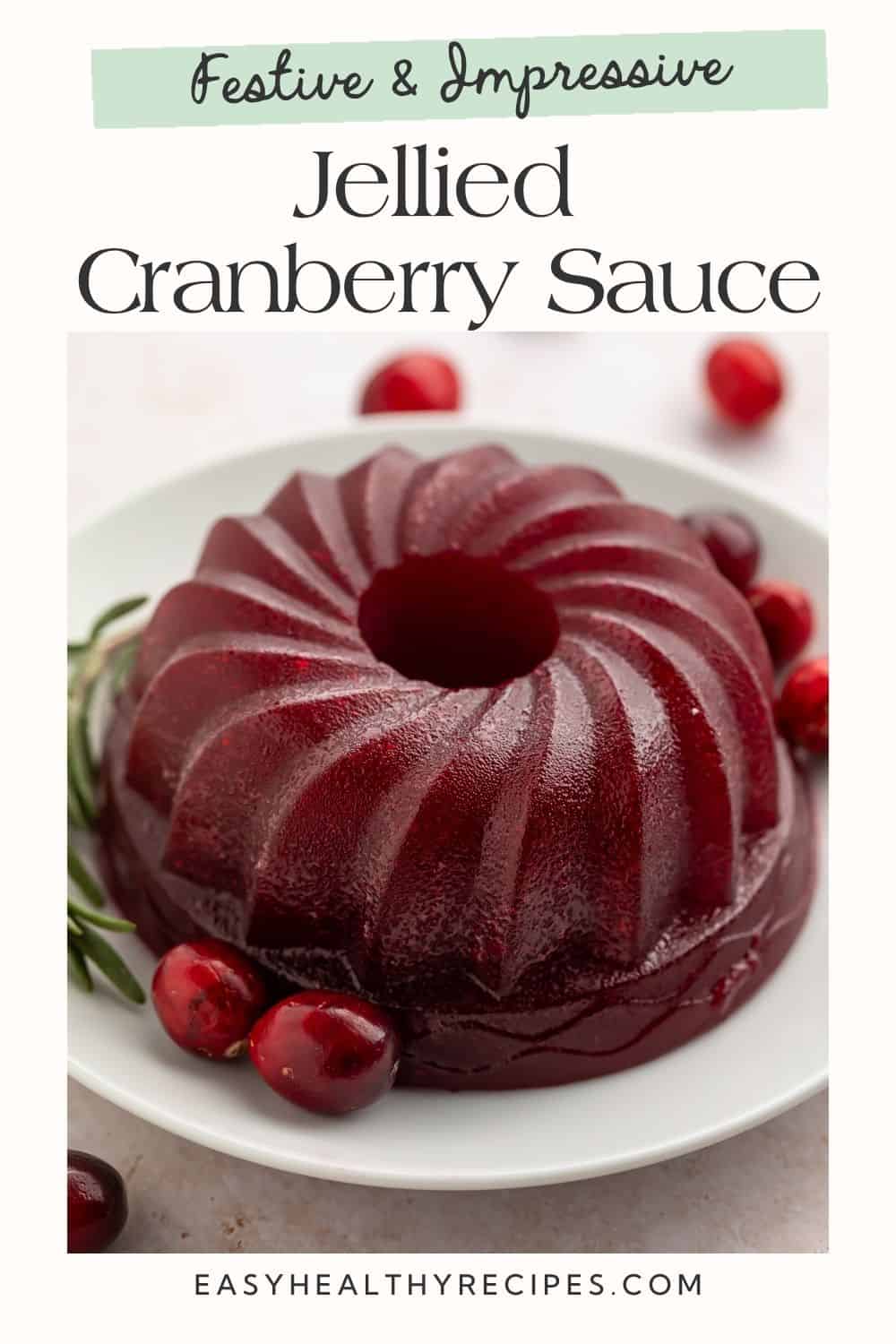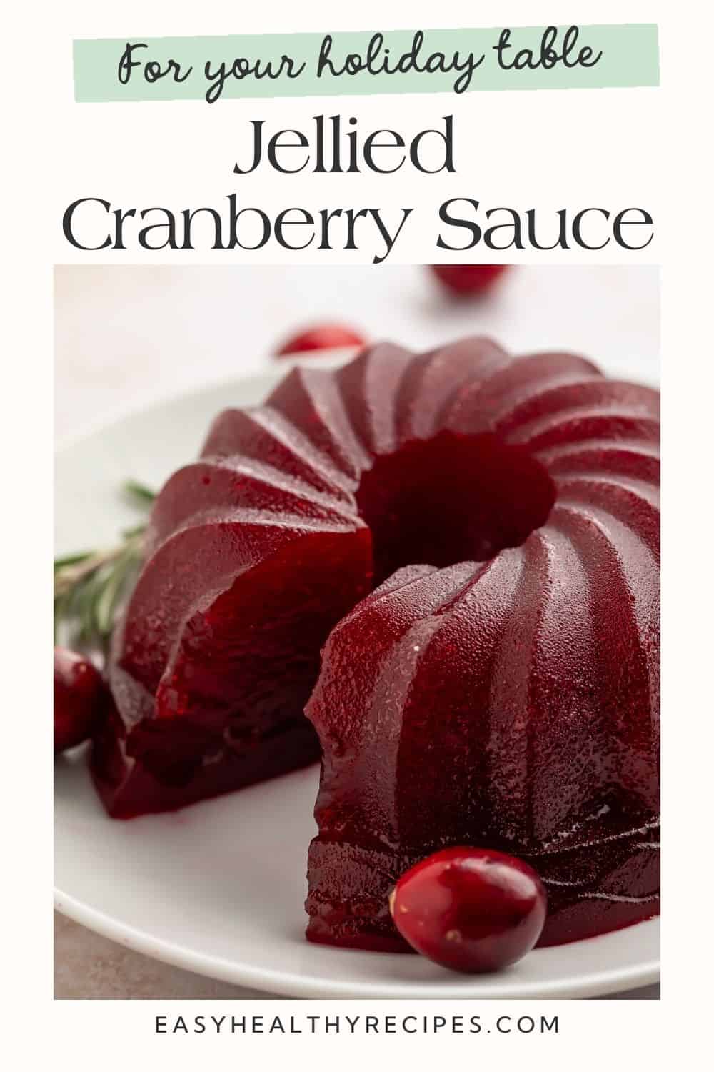 Jellied cranberry sauce set into a wreath shape with a slice missing on a white plate. Text is overlayed in the style of a Pinterest pin.
