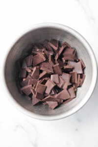 Line a baking or cookie sheet with parchment paper and set to the side. Break your dark chocolate into small pieces and add to a bowl that's safe for heating.