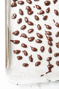 With a fork, remove the almonds one by one, wiping any excess chocolate on the side of the bowl. Place them onto the lined baking sheet and sprinkle with sea salt and chili powder. Place the baking sheet in the freezer for about 30 minutes to allow the chocolate to harden.