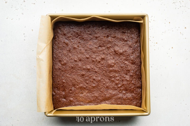 Fold or clip excess parchment paper down to cover outside of baking pan. Once the brownies have cooled, the extra paper can be used as handles to gently lift the brownies out of the pan.